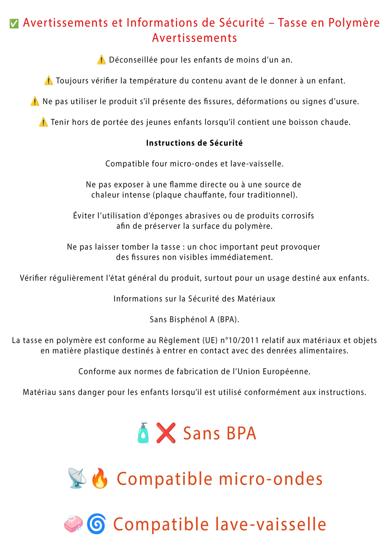 La tasse en polymère est conforme au Règlement de l'Union Européenne n°10/2011 concernant les matières plastique destinées à entrer en contact avec des denrées alimentaires. Elle correspond aux normes de fabrication de l'UE et ne présente aucun danger pour les enfants.